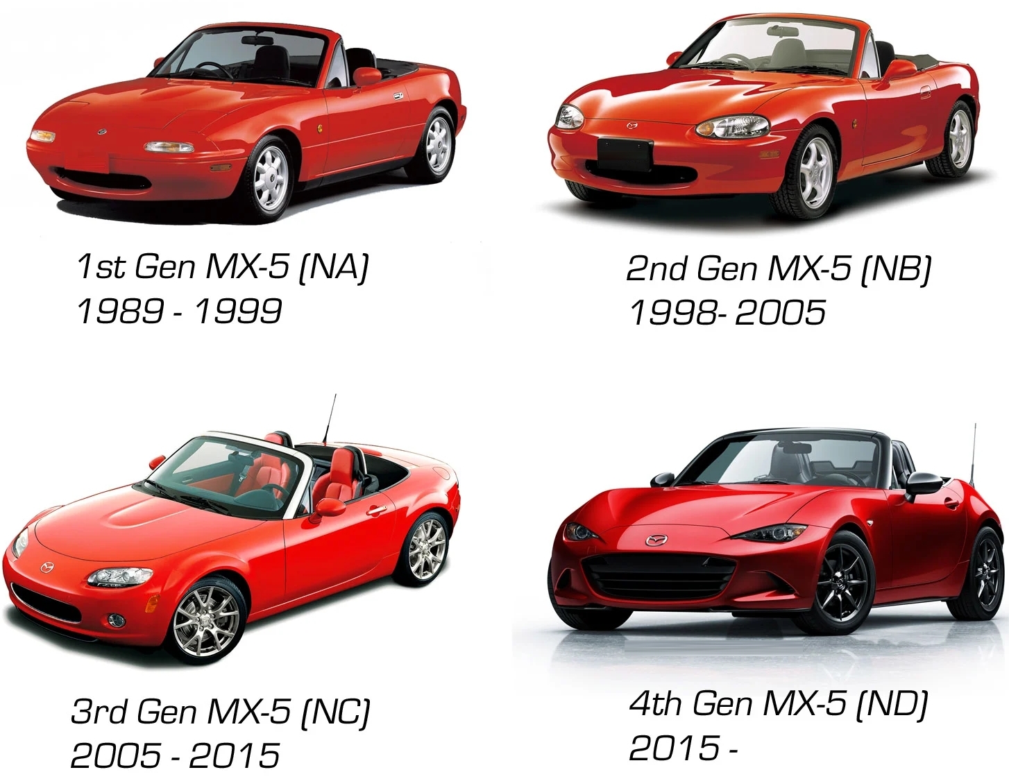 Als stolzer Besitzer eines NB-Modells aus dem Jahr 1999 beschäftige ich mich technisch nahezu ausschliesslich mit der zweiten MX5-Generation. Die ersten beiden Generationen, NA und NB, welche von 1989 bis 2005 gebauten wurden, sind in weiten Teilen technisch so nahe beieinander, dass Wartung und Reparatur bei beiden Modellen sehr ähnlich sind. So ist es sinnvoll den NA geistig in diese Betrachtungen einzuschliessen. Dank der "alten" Technik lassen sich von Hobby-Schraubern auch umfangreichere Wartungs- und Reparaturarbeiten in der heimischen Garage erledigen.Die Generationen des MX5